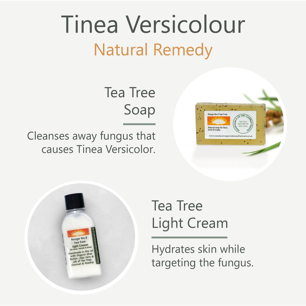 1 x Soap + 1 x Cream: Samples from the top range that have received the most positive feedback for getting rid of Tinea Versicolour - Tea Tree. A 40g soap along with the matching 25ml Light Cream. With regular use can help keep your skin healthy, happy and fungal infection free.