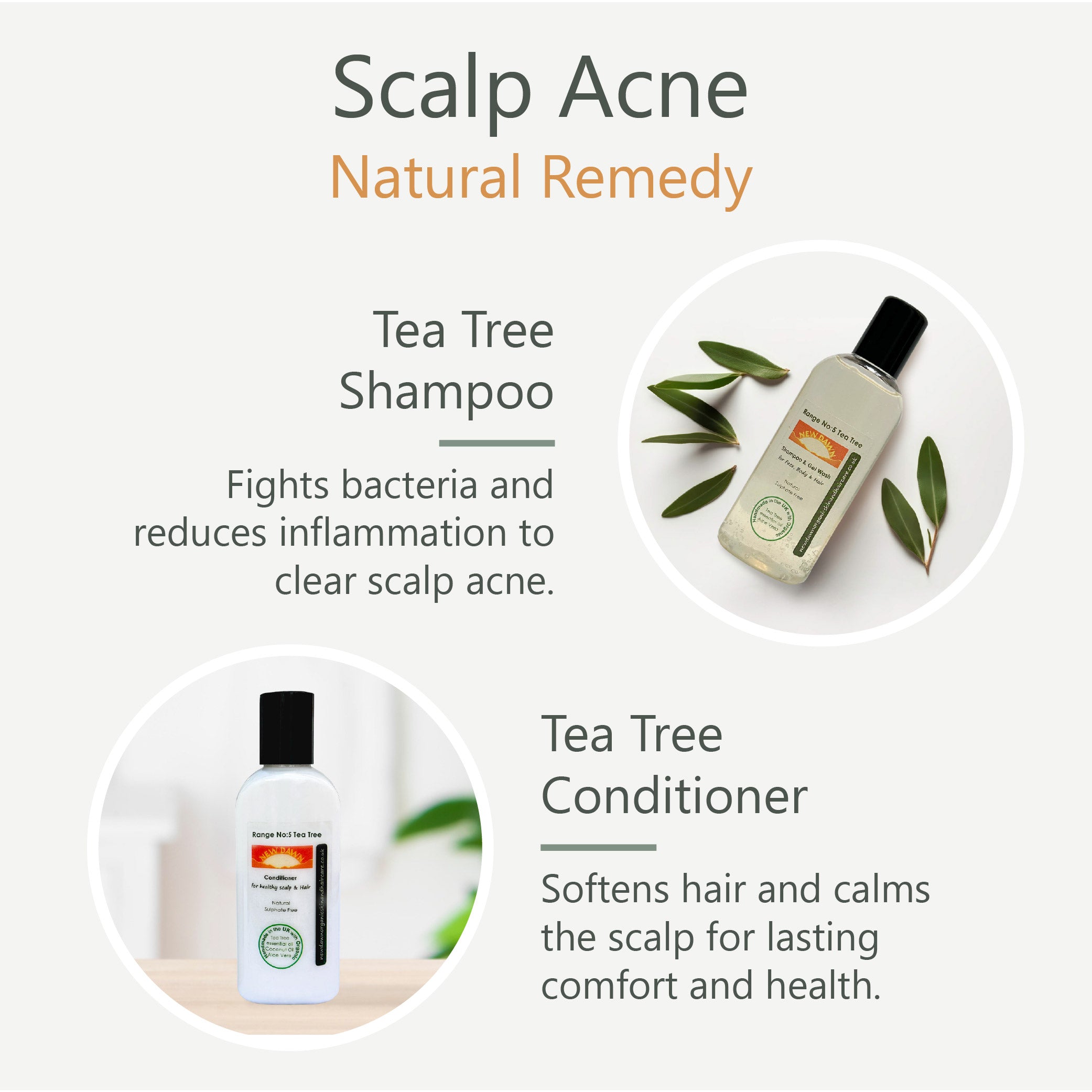 100ml of the top Shampoo and Conditioner for getting rid of acne and soothing scalps - Tea Tree Shampoo + Tea Tree Conditioner. With regular use can help keep your scalp healthy, hydrated and without Acne spots.